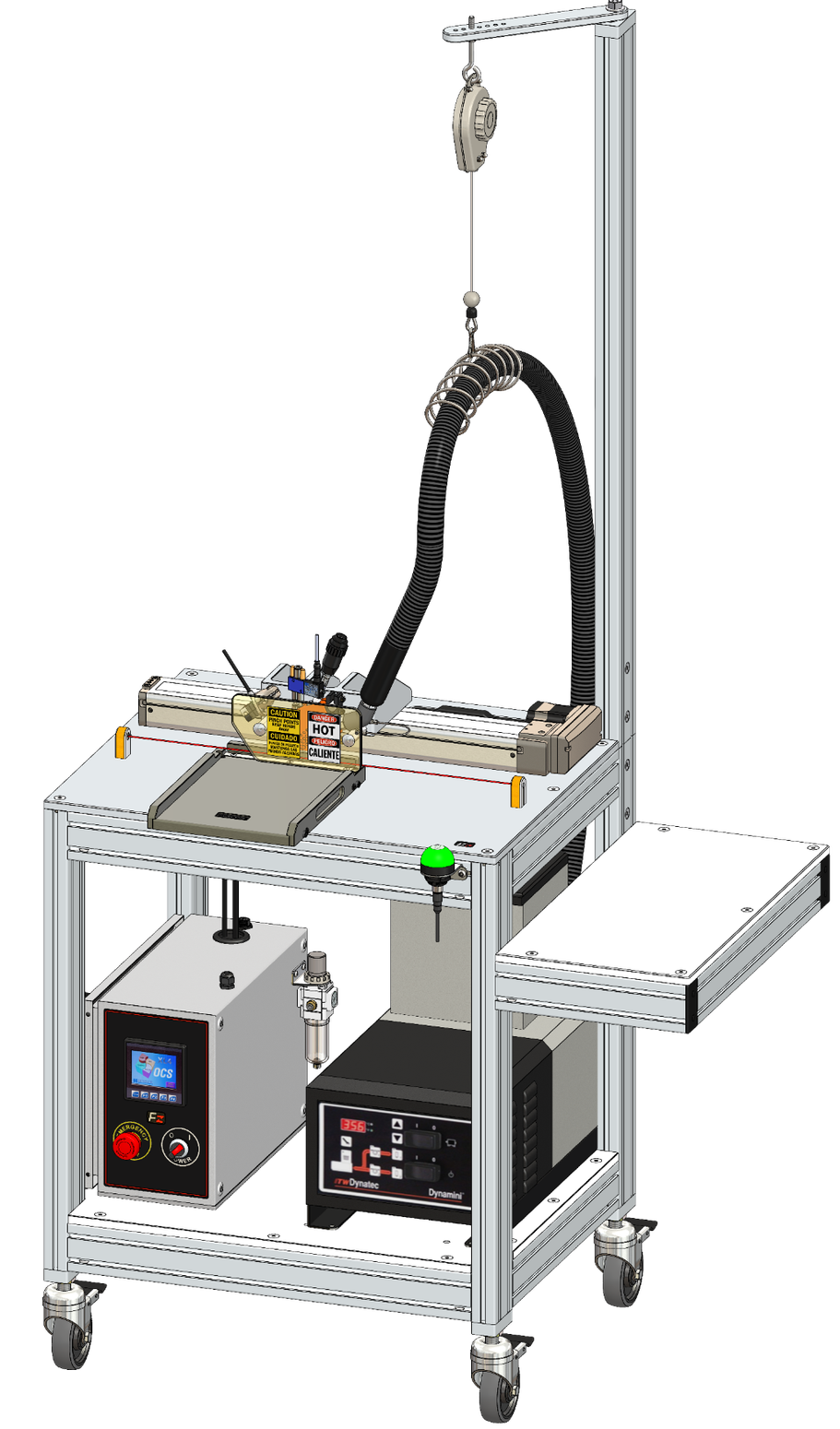 When integrated into a mobile workstation, each hot-melt dispenser is surrounded by a large removable safety cage with light curtains which protect the operator during any unsafe conditions. An extruded aluminum frame with a CNC machined aluminum top plate provides a platform for our quick-change tooling system. Each job can be configured rapidly by swapping nests and fixtures which are magnetically attached and located in position.