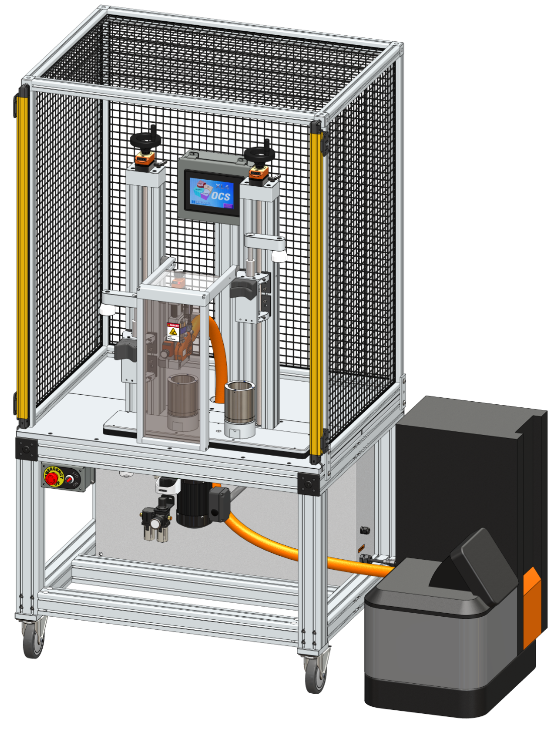 When integrated into a mobile workstation, each hot-melt dispenser is surrounded by a large removable safety cage with light curtains which protect the operator during unsafe conditions. An extruded aluminum frame with a CNC machined aluminum top plate and shuttle provides a platform for our quick-change tooling system. Each job can be configured rapidly by swapping nests and fixtures which are magnetically attached and located in position.