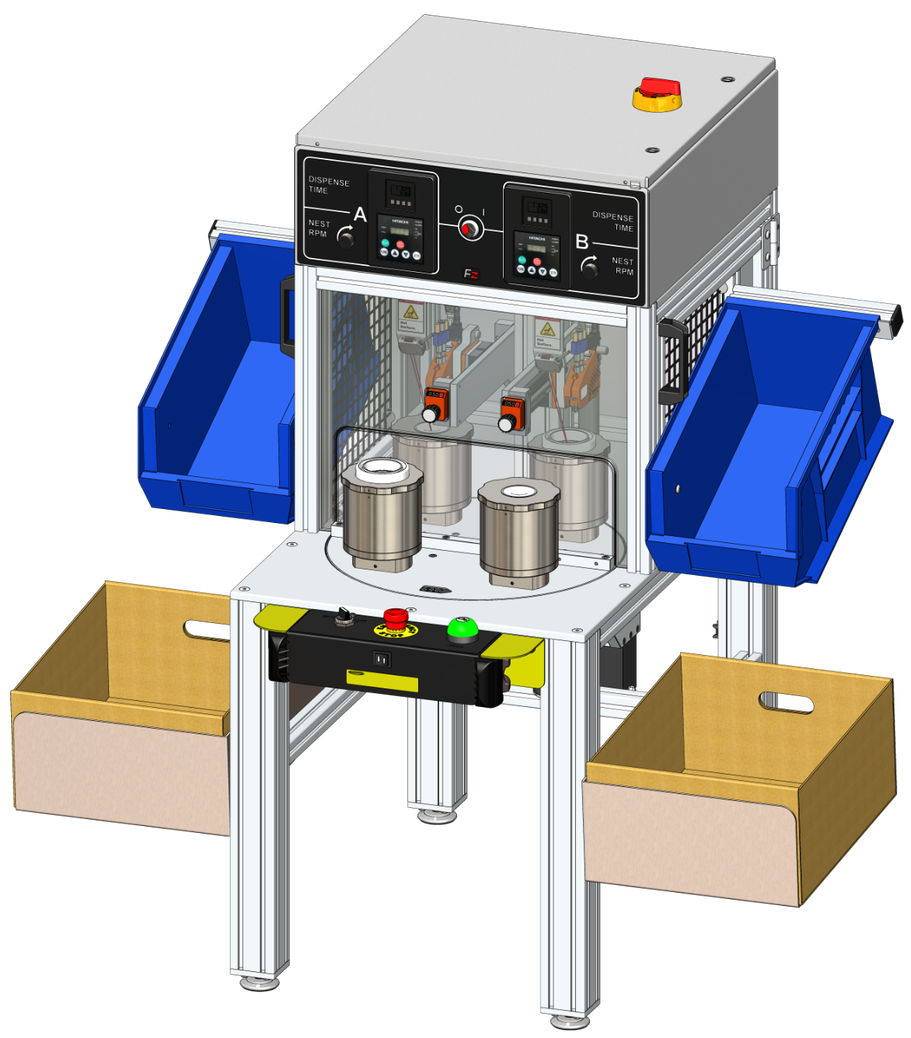 - Variable Speed AC Inverter Motor – The drive system which rotates the nests during adhesive dispensing is an inverter-duty 3-phase motor controlled by a VFD. Rotation speed is per recipe and controls the fill evenly and quietly.