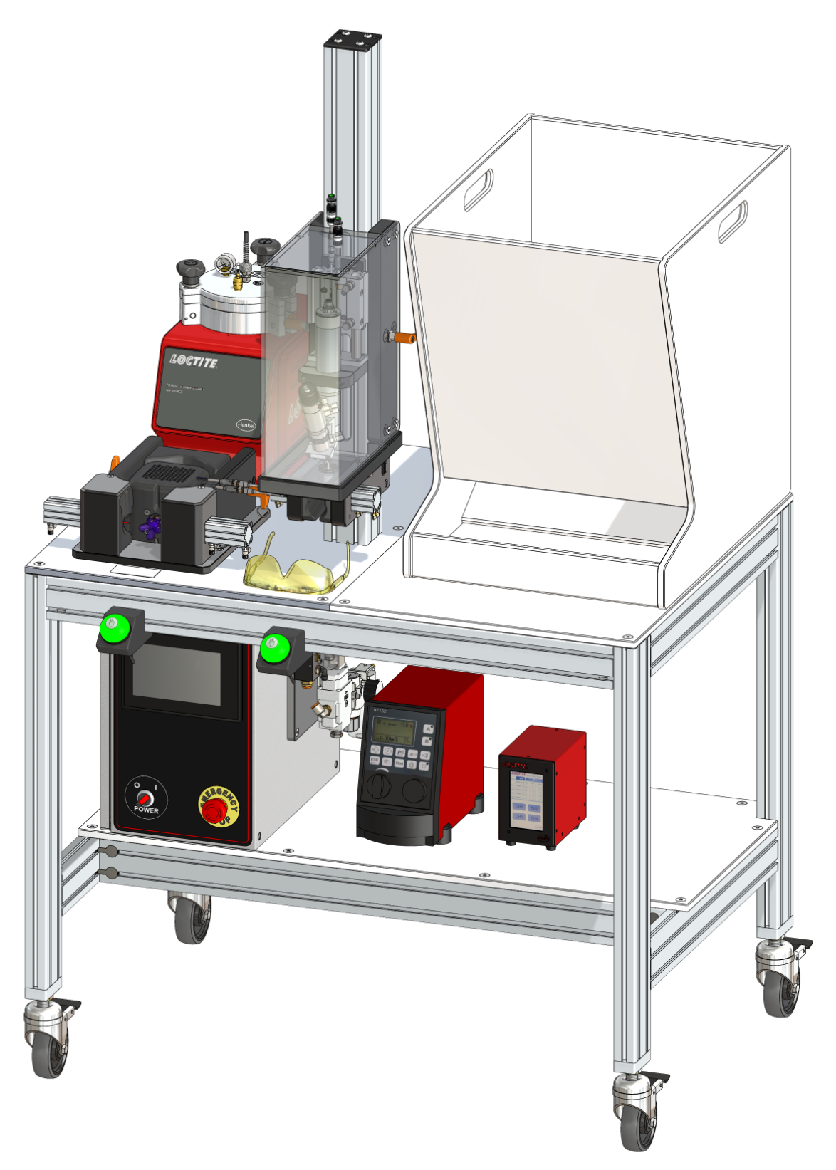 - UV Protection enclosures – The glued part is placed within a protected enclosure to ensure operator safety while ultra violet light is used to cure the adhesive. The enclosure is fabricated from black polypropylene, aluminum, or other opaque material as desired.