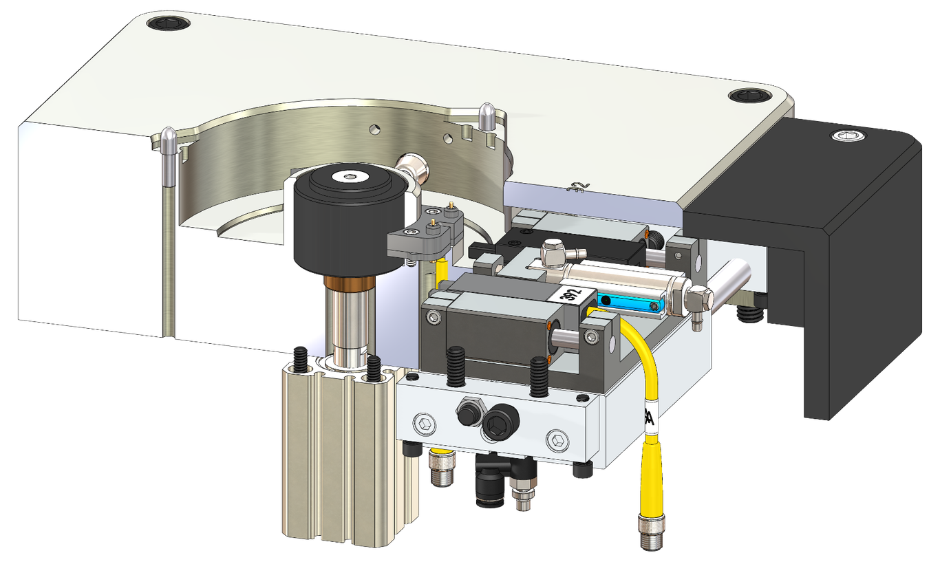 A production automated electronic tester to verify each plastic insert-molded speaker basket is perfect for its use in robotic production lines of European cars. Each speaker basket is precisely fixtured within a CNC machined nest while various probes and continuity sensors perform quality tests. Each speaker is verified to conform to the exacting standards required by the high-end German marque manufacturer.