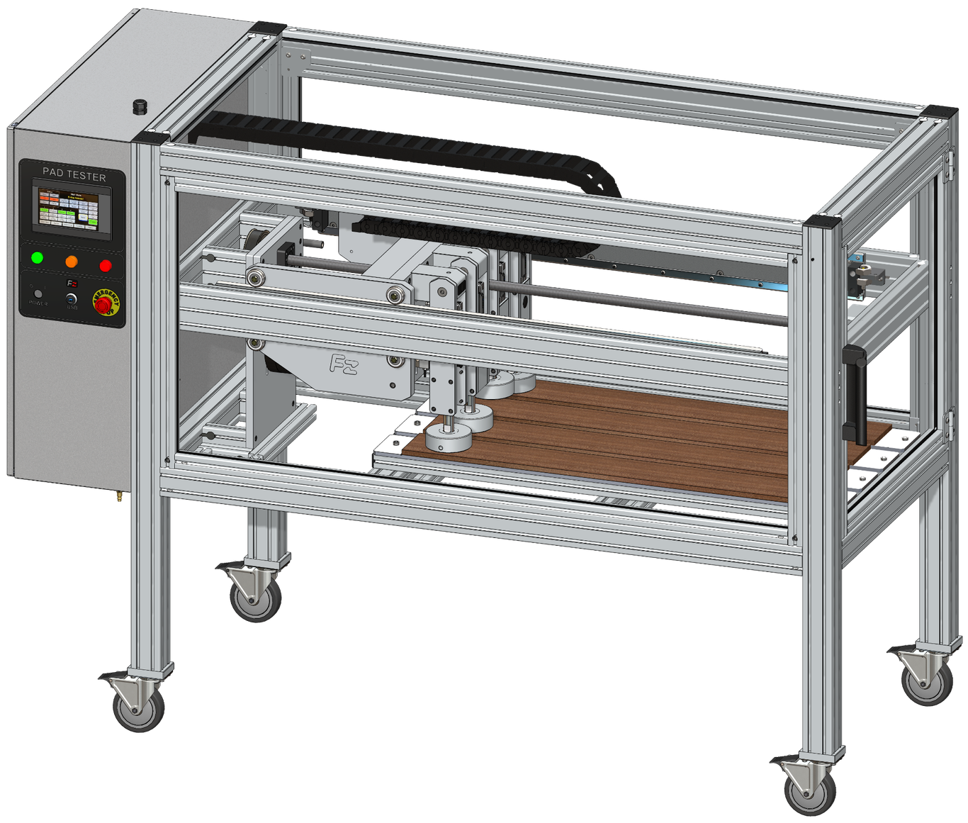 An automatic endurance testing machine which subjects four individual furniture glide pads on unique substrates to oscillating sliding forces. Each independent head can alter the pad force, the pad angle, and track the resulting drag force during the entire test. Fully programmable and able to subject pads to high cycle tests.