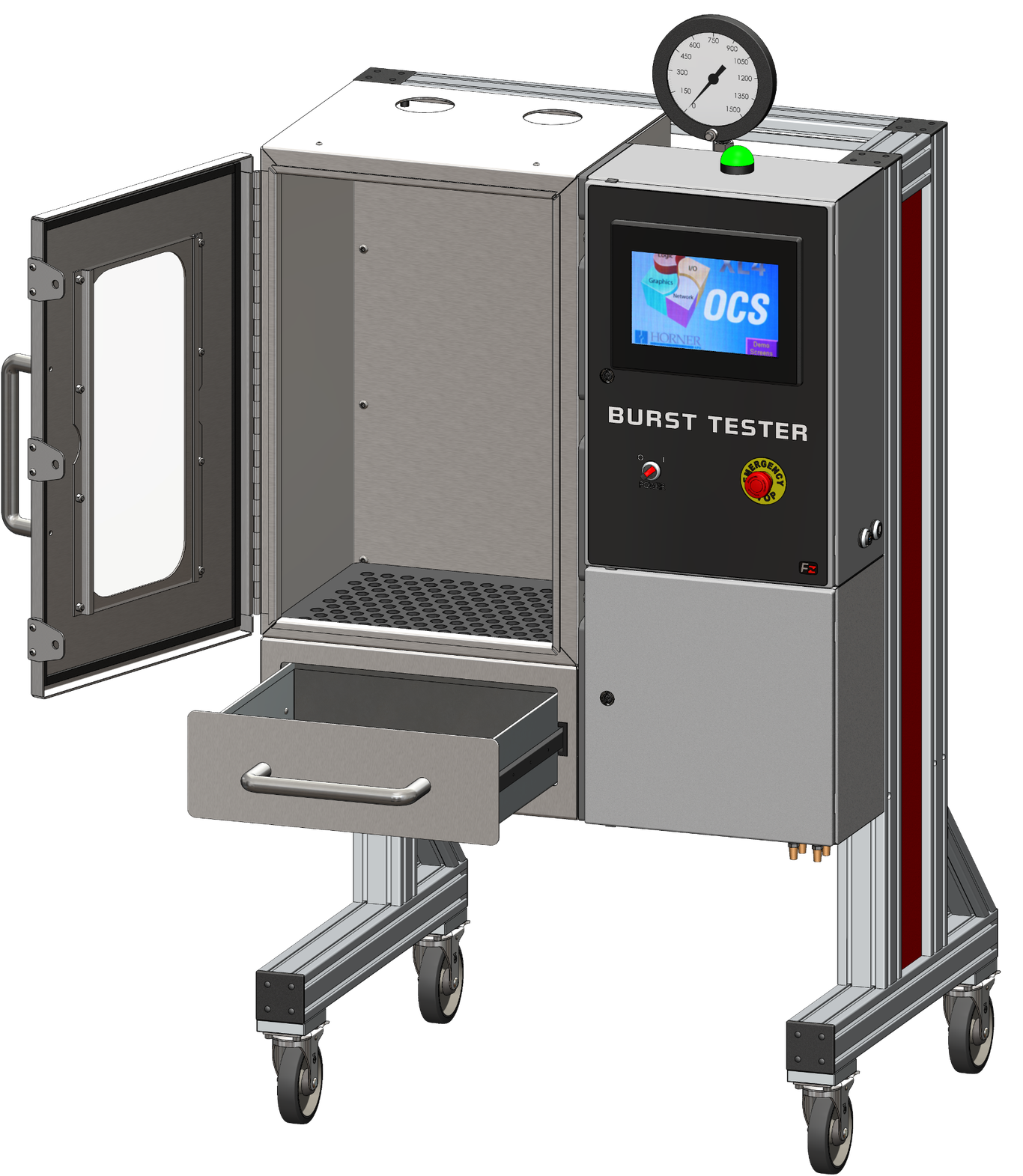 The burst tester automates the entire testing process with a push of a button to; flush, ramp with pressure, identify instant of failure, and end the test.