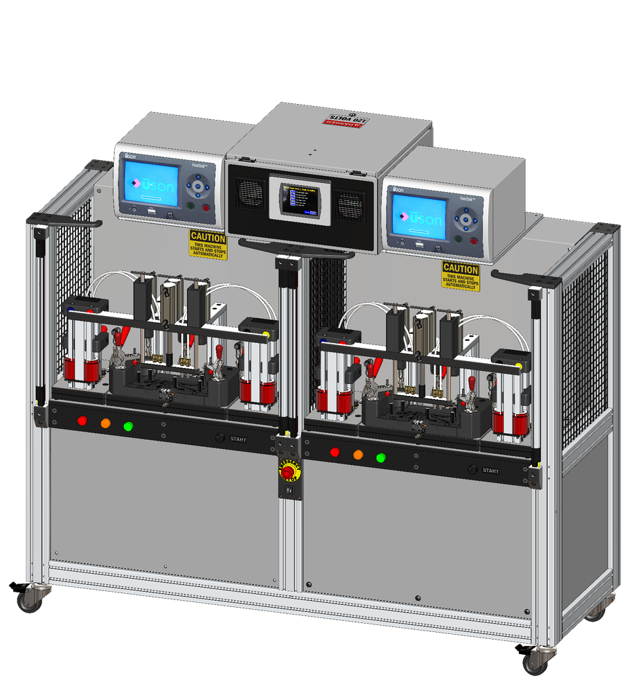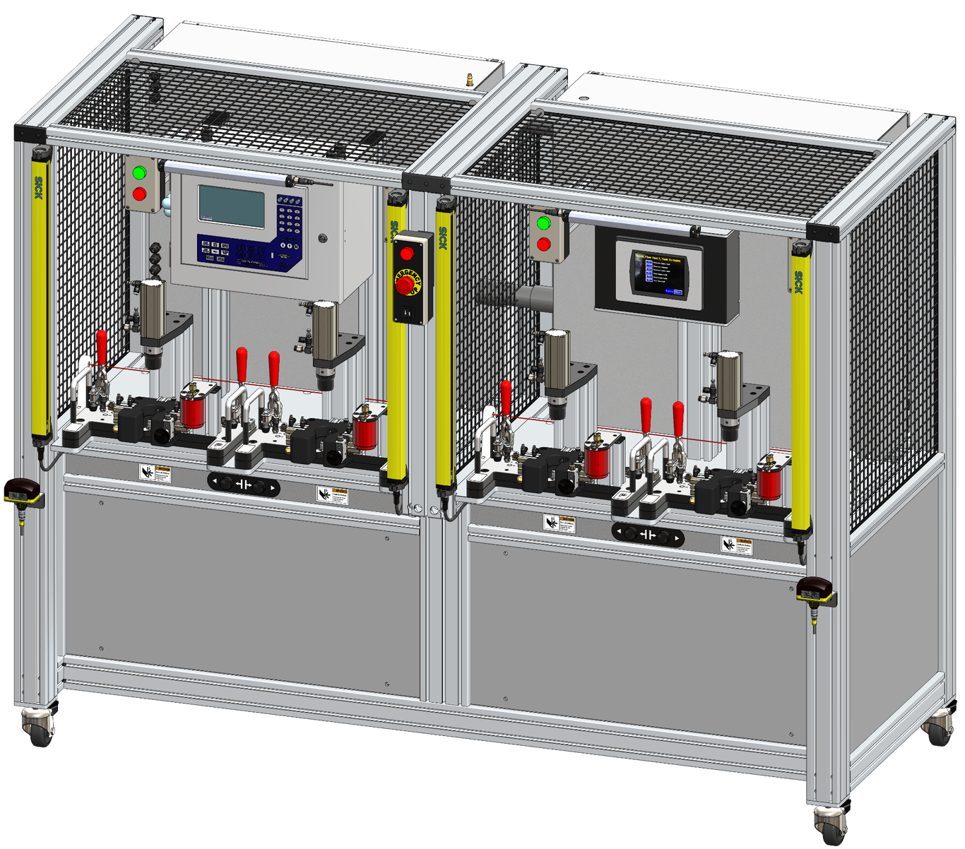 We help our customers select the best testing method and identify a suitable leak tester such as Uson, Cincinnati, Cosmo, Laco etc. We design and manufacture the necessary tooling to fixture and plug the test parts and provide protection for the operator from any moving parts and high pressure. Our testing machines use a PLC to automate the testing and safety processes, provide recipe selection for different fixtures and parts, and mark parts as passed.