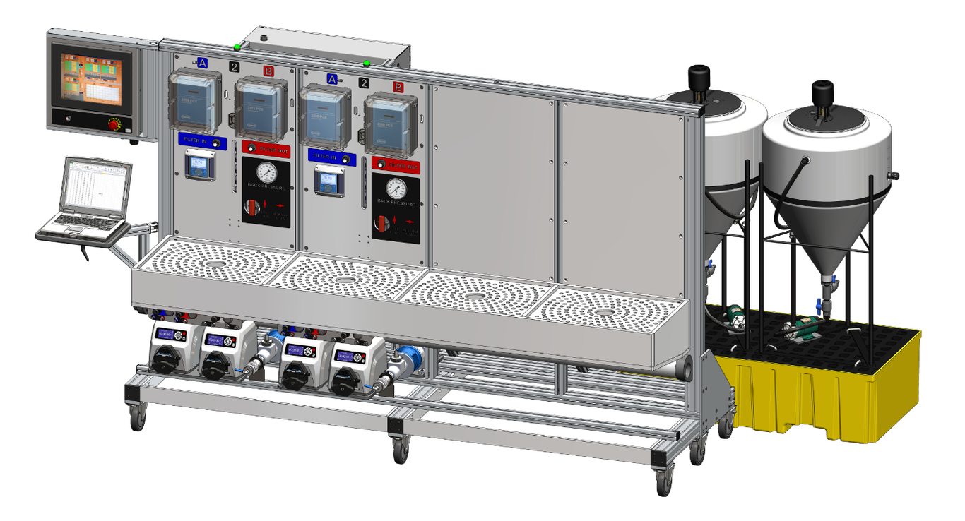 The entire flow stand is automated by a PLC controller and can be programmed for a variety of schedules, concentrations, capacities etc.