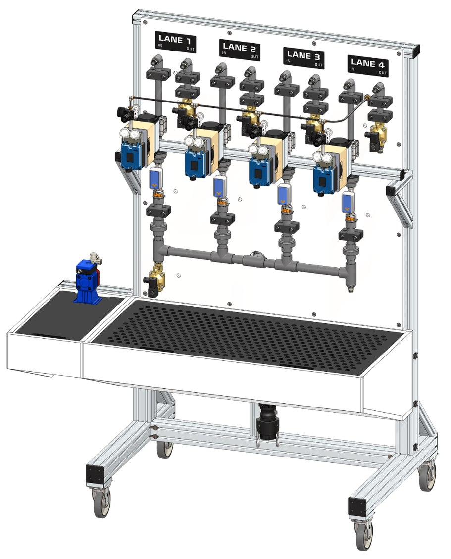 Flow stands are typically constructed on an extruded aluminum framework with stainless fasteners and casters. A polypropylene tub with removable grates that catch spillage and provides a surface to hold test devices. Polypropylene back boards are used to mount the instrumentation and piping. Often times, a variety of pre-filtration elements are used to clean the incoming city water supply to create the clean water before injecting the contaminants. Water that has been injected with the various contaminants and chemicals can be cleaned through a series of other post-treatment filters before being discharged into the city sewer system. Various pumps and containers can be fitted to lower shelving and side shelves as desired. We can also provide full stainless steel stands as desired.