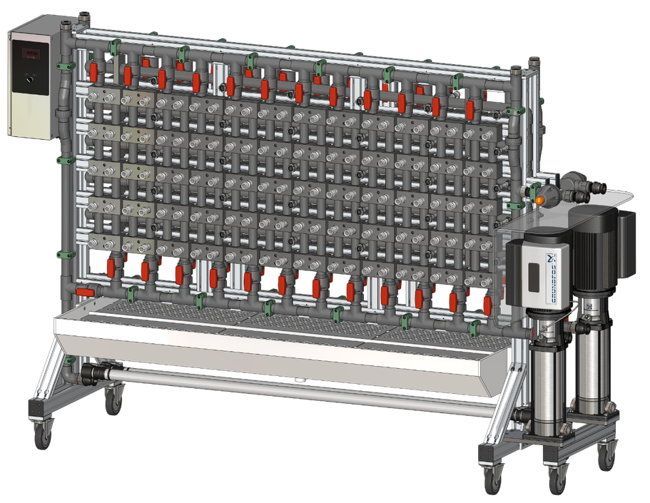 Fritze Dezein has built a variety of Flow Stands using peristaltic pumps, vertical multistage centrifugal pumps, progressing cavity pumps, magnetic drive pumps, and diaphragm dosing pumps to blend water and chemicals for the production of an influent test water. Various flow meters such as turbine, paddle-wheel, magnetic, thermal, and vortex can be selected to meet the desired needs for accuracy and resolution. Control valves such as actuated ball valves, pinch valves, angle seat valves, solenoid valves, and servo operated valves can be used to control the flow through the water treatment devices.